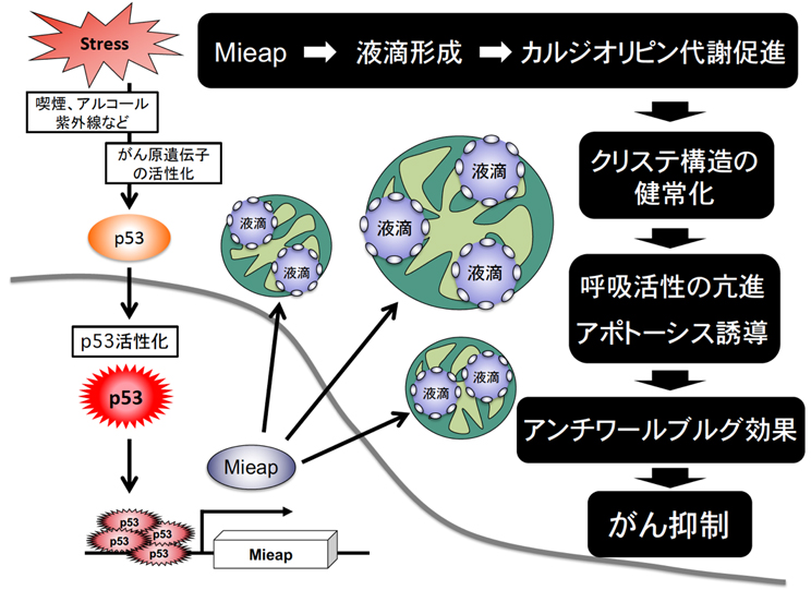 図2.Mieapはミトコンドリアに液滴を形成しカルジオリピン代謝を促進することでがんを抑制している