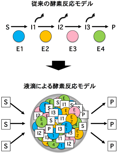 図3.液滴は代謝連続反応を区画化し酵素や基質を濃縮することで酵素反応を促進する