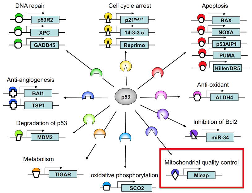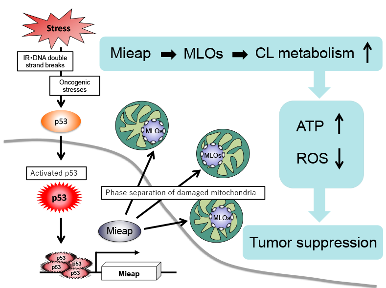 Mitochondria-eating protein (Mieap, also designated as SPATA18) was originally identified as a p53-inducible protein; its mRNA expression is directly regulated by the tumor suppressor p53 in response to various cellular stresses, including DNA damage (PLoS ONE 6: e16054, 2011). Mieap expression is lost in nearly 50% of human cancer cell lines due to promoter methylation. Mieap-deficient LS174T colorectal cancer cells exhibit increased mitochondrial reactive oxygen species (ROS) generation and decreased mitochondrial ATP synthesis. The mitochondrial ROS in Mieap-deficient colorectal cancer and gastric cancer cells enhance the migration and invasion activities of cancer cells under hypoxic conditions (Oncogenesis 5: e181, 2016; Scientific Reports 9: 2822, 2019). Mieap-deficient ApcMin/+ mice exhibit the promotion of intestinal tumor initiation and malignant transformation (Scientific Reports 5: 12472, 2015). Tumors in Mieap-deficient ApcMin/+ mice have revealed abnormal morphology of the mitochondria, such as enlarged size, round shape, and a decrease in the cristae structure. Recently, Mieap expression was reported to be defective in thyroid oncocytic cell tumors, which exhibit accumulation of abnormal mitochondria in tumor cells (Cancer Sci. 111: 2814–2823, 2020). Mieap-regulated mitochondrial quality control is inactivated in the tumor tissues of nearly 70% of colorectal cancer, 25% of breast cancer, 70% of gastric cancer, and 83% of esophageal cancer patients (Oncogenesis 5: e181, 2016; Cancer Sci. 109: 3910–3920, 2018; Biochem Biophys Res Commun. 529: 582-589, 2020). Mieap is associated with better survival in breast cancer patients (Am J Cancer Res. 11: 6060-6073, 2021). These observations suggest that Mieap plays a critical role in tumor suppression via its mitochondrial quality control function. However, the mechanism underlying the regulation of mitochondrial quality control by Mieap remains unclear.