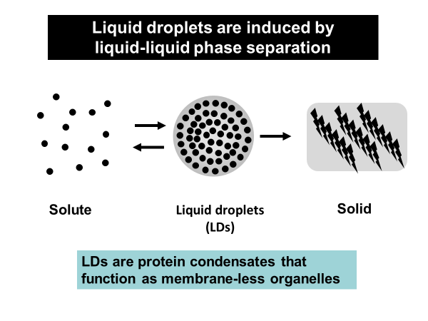 Liquid droplets (LDs) in cells are protein condensates, which are composed of proteins, nucleic acids, and other macromolecular components (Droplets of life, 2022, Elsevier). LDs are formed by proteins with an intrinsically disordered region(s) (IDR) via liquid-liquid phase separation (LLPS) (Figure 2).