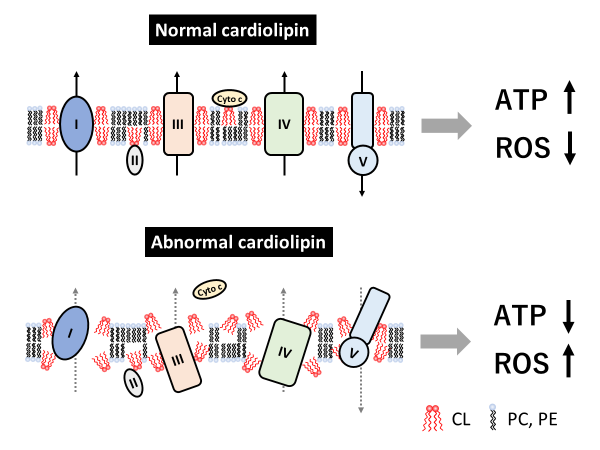 CL is a phospholipid dimer, which has two phosphate residues and four fatty acyl chains. Because of this unique structure, it forms a cone shape, which plays a critical role in forming the curvature of the lipid membrane, contributing to maintenance of the mitochondrial cristae structure. CL is the only phospholipid that is specific to the mitochondria and is mainly located at the inner mitochondrial membrane and contact sites. CL interacts with many mitochondrial membrane proteins, including the electron transport chain complexes involved in oxidative phosphorylation and the ADP/ATP carrier; the interaction with CL promotes the activity of these proteins. CL stabilizes the structural assembly and activity of the respiratory super-complexes at the inner mitochondrial membrane. CL interacts with cytochrome c at the outer surface of the inner mitochondrial membrane, which plays a pivotal role in the life and death of cells by maintaining stable respiratory ATP production and inducing apoptosis, respectively. Therefore, altered CL metabolism and/or deterioration of CL quality causes various mitochondrial dysfunctions and diseases via abnormal cristae structures, decreased ATP synthesis activity, and increased ROS generation (Figure 3).